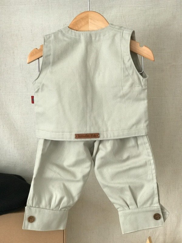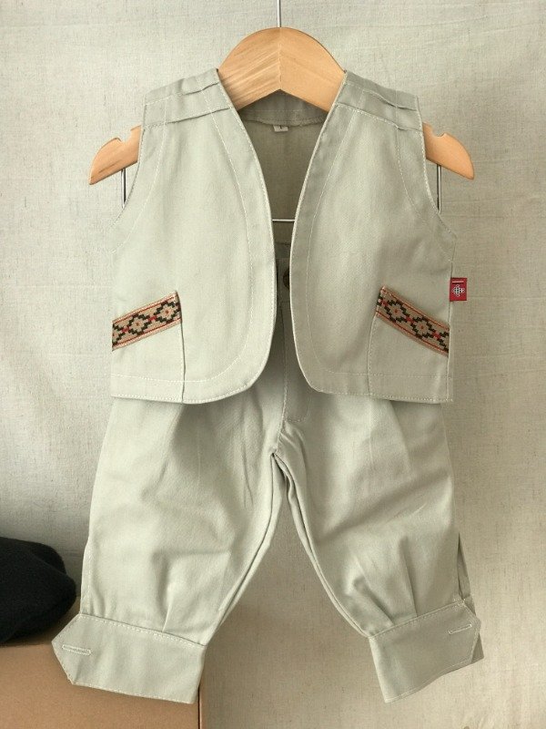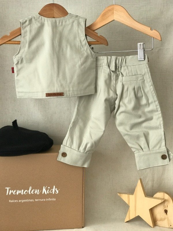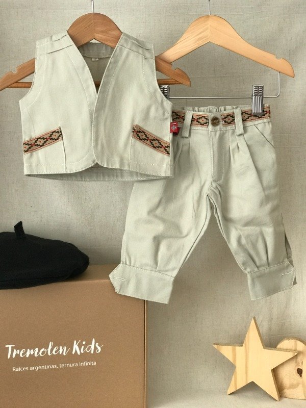 Bombacha de campo con guarda pampa en cintura, bolsillos laterales y bolsillo ojal trasero, cremallera con cierre y boton, elástico en cintura media para mayor comodidad del bebé. Chaleco con alforzas en hombros, dos bolsillos delanteros con detalle de guarda pampa en ambos. Motivo de guarda pampa puede llegar a variar sutilmente según disponibilidad. Tela: Gabardina 100% algodón.