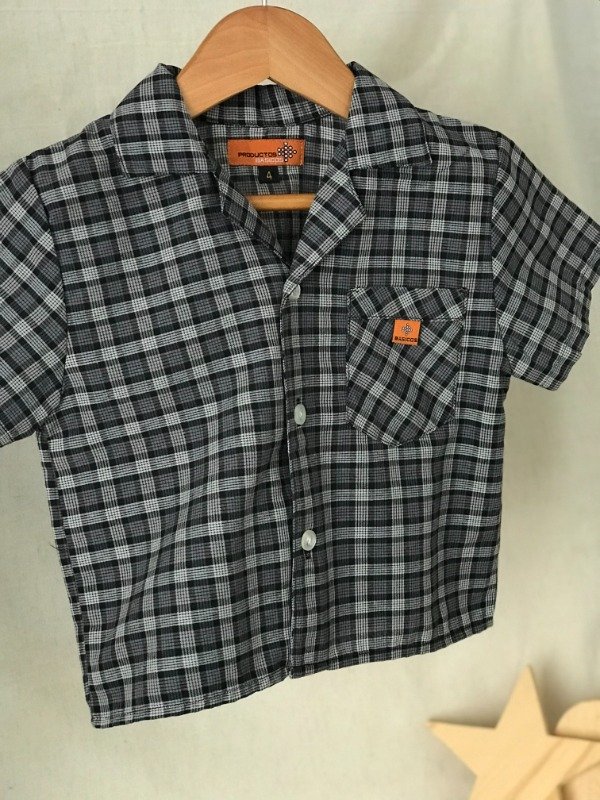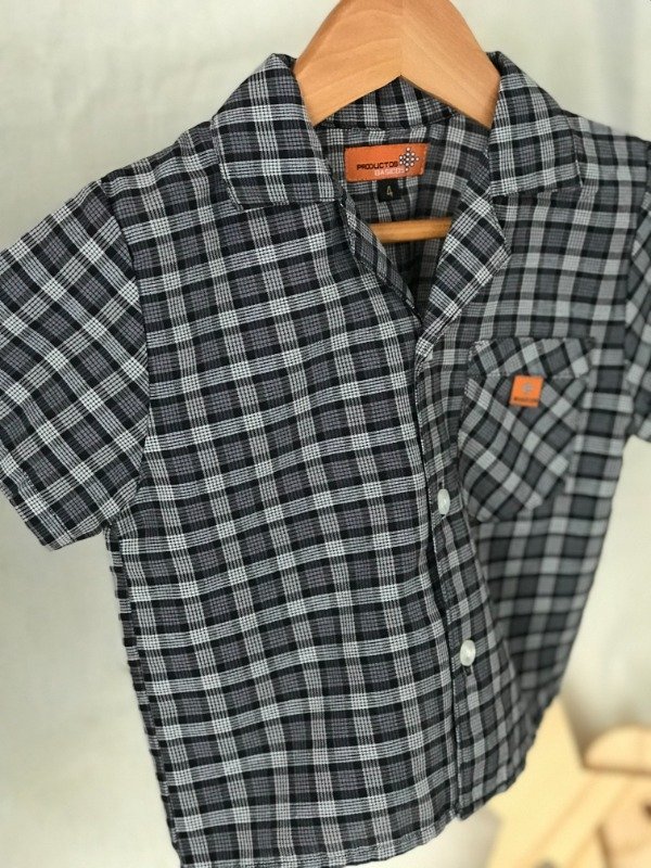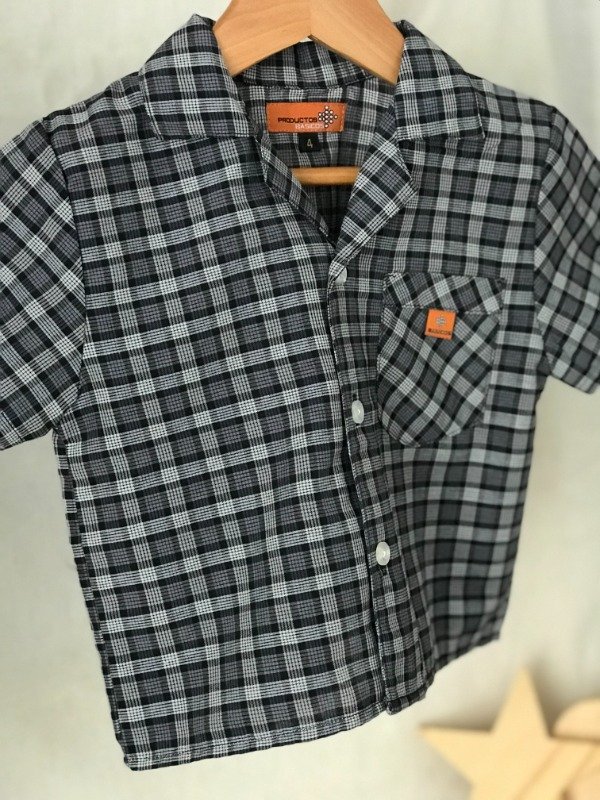 Camisa de manga corta con diseño clásico a cuadros en tonos azules y grises. Con cuello camisero, botones delanteros y bolsillo delantero, es una prenda práctica y versátil.