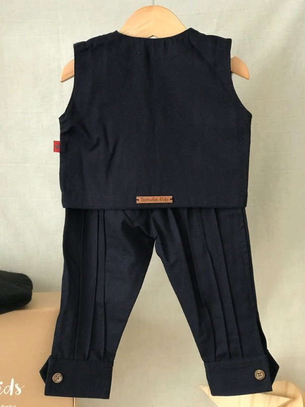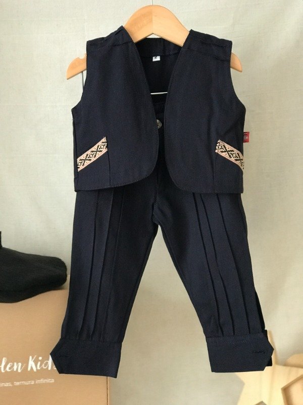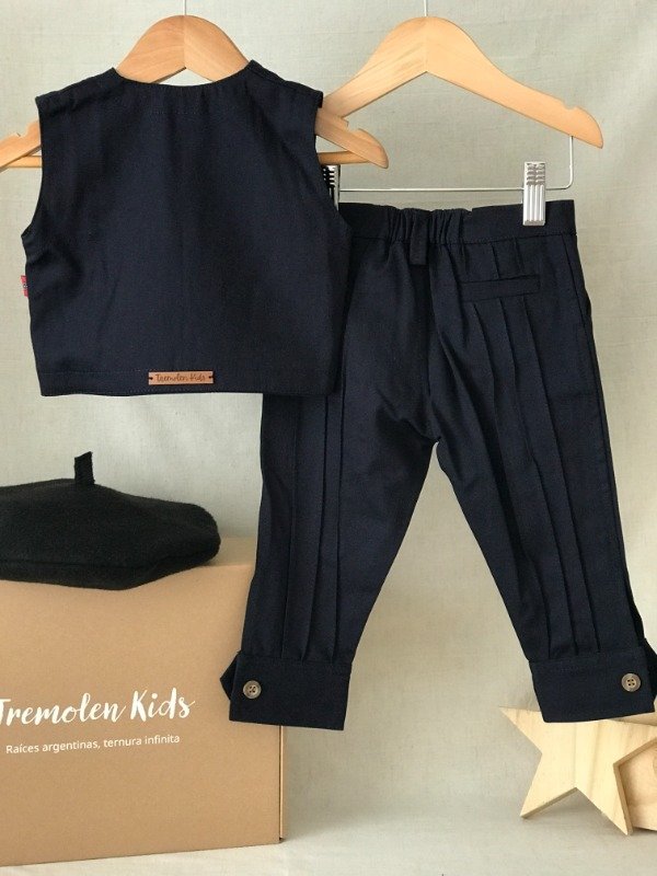 Bombacha de campo con alforzas delanteras y traseras, guarda pampa en cintura, bolsillos laterales y bolsillo ojal trasero, cremallera con cierre y boton, elástico en cintura media para mayor comodidad del bebé. Chaleco con alforzas en hombros, dos bolsillos delanteros con detalle de guarda pampa en ambos. Motivo de guarda pampa puede llegar a variar sutilmente según disponibilidad. Tela: Gabardina 100% algodón.