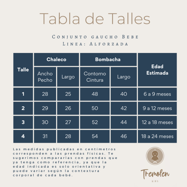 Disponible en cuatro talles: 6 a 9 meses / 9 a 12 meses / 12 a 18 meses / 18 a 24 meses.