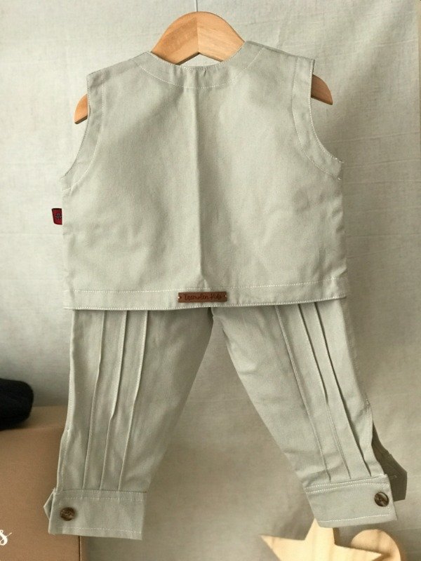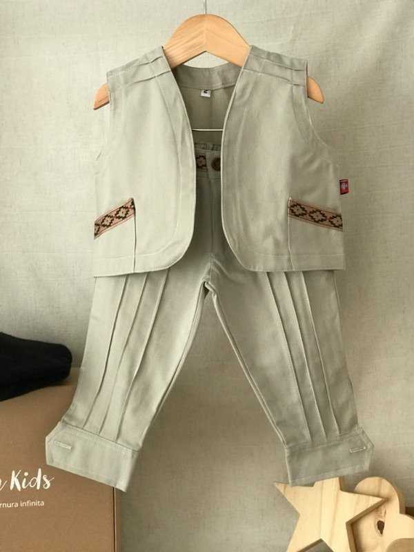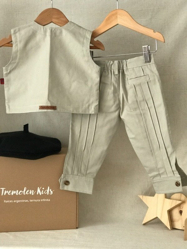 Bombacha de campo con alforzas delanteras y traseras, guarda pampa en cintura, bolsillos laterales y bolsillo ojal trasero, cremallera con cierre y boton, elástico en cintura media para mayor comodidad del bebé. Chaleco con alforzas en hombros, dos bolsillos delanteros con detalle de guarda pampa en ambos. Motivo de guarda pampa puede llegar a variar sutilmente según disponibilidad. Tela: Gabardina 100% algodón.