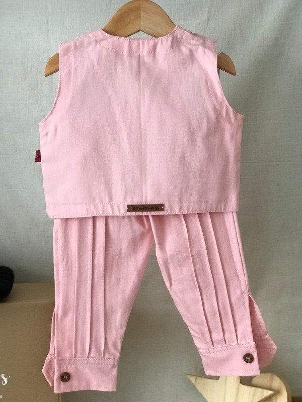 Bombacha de campo con alforzas delanteras y traseras, guarda pampa en cintura, bolsillos laterales y bolsillo ojal trasero, cremallera con cierre y boton, elástico en cintura media para mayor comodidad del bebé. Chaleco con alforzas en hombros, dos bolsillos delanteros con detalle de guarda pampa en ambos. Motivo de guarda pampa puede llegar a variar sutilmente según disponibilidad. Tela: Gabardina 100% algodón.