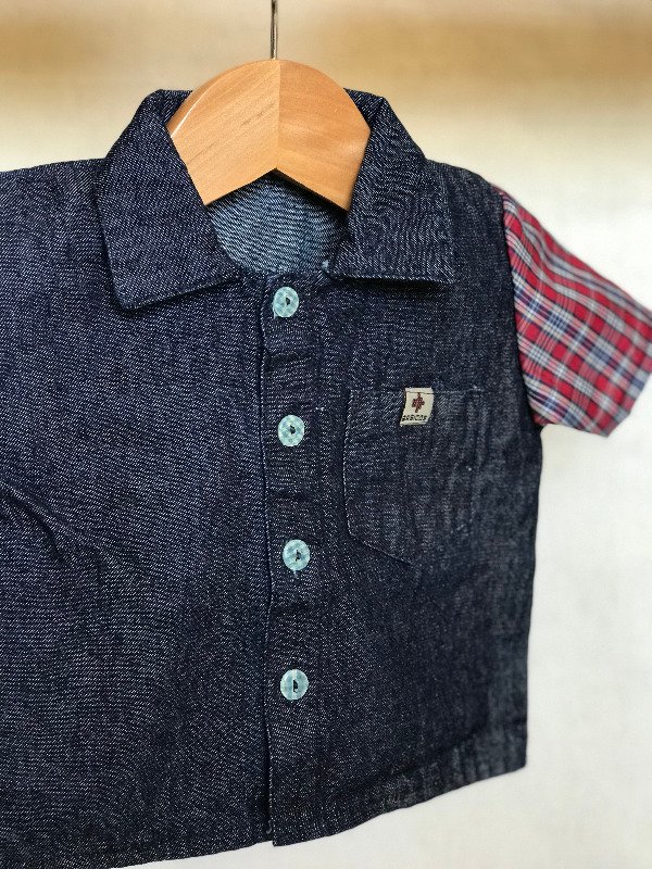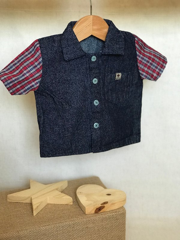 Camisa con cuerpo de tela jean y mangas a cuadros rojos.