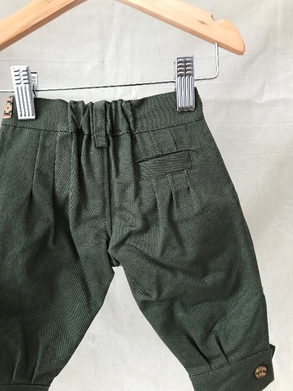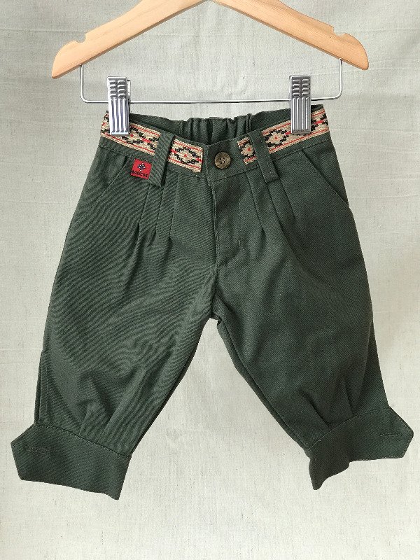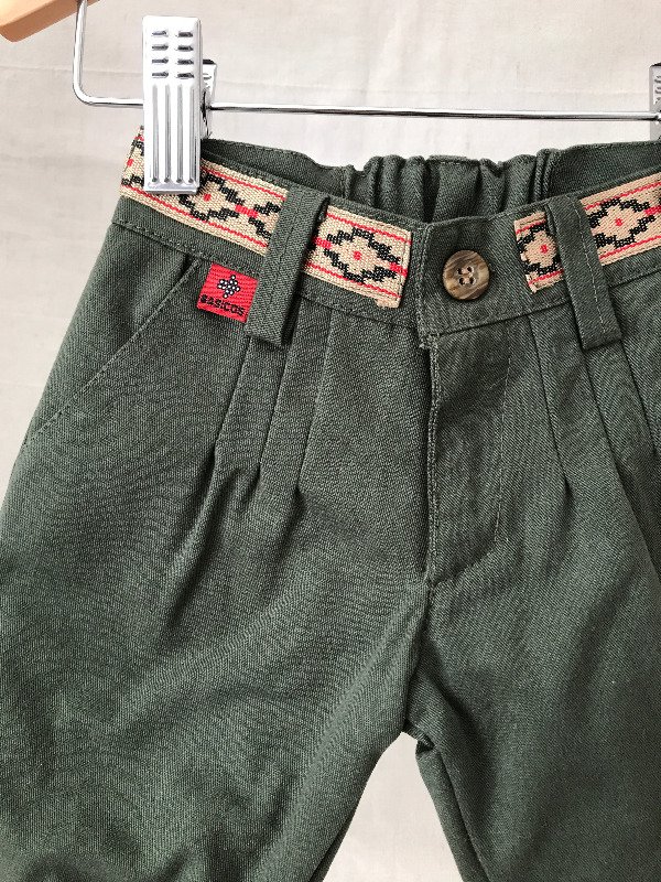 Bombacha de campo con guarda pampa en cintura, bolsillos laterales y bolsillo ojal trasero, cremallera con cierre, elástico en cintura media para mayor comodidad del bebé. Motivo de guarda pampa puede llegar a variar sutilmente según disponibilidad. Tela: Gabardina 100% algodón.